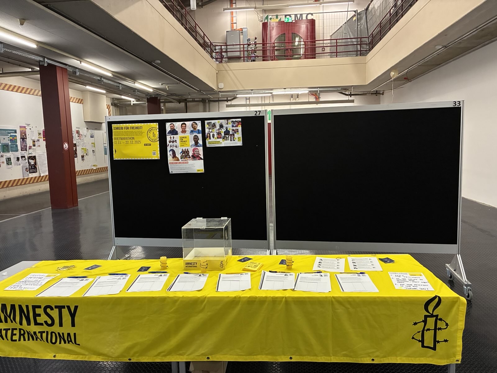 Auch in diesem Jahr haben wir in der zentralen Halle der Uni Bielefeld einen Stand aufgebaut, an dem Ihr Euch für zehn ausgesuchte Fälle des Amnesty International Briefmarathons einsetzen könnt.